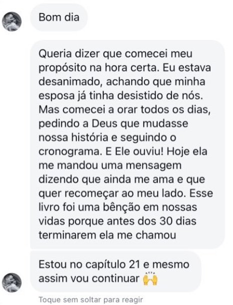 Cada casal tem um tempo diferente de transformação. Algumas pessoas percebem mudanças já nos primeiros dias, outras ao longo das semanas. O importante é manter a constância e viver cada dia do propósito com fé.